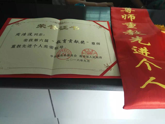 2016年9月10日,值此每年一度的教师节之际,周浩波董事长荣获莲花县委、县政府颁发的“尊师重教先进个人”奖。