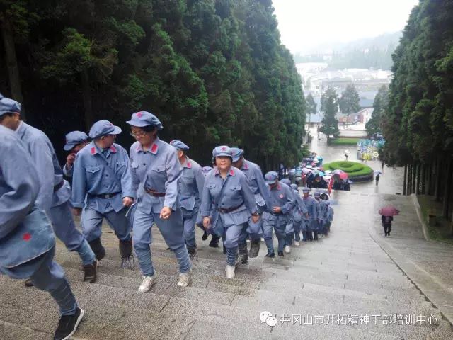 两批学员共计120人,在各自为期三天的培训学习中,全程采取军事化、组织化管理,在“坚定信念,艰苦奋斗,实事求是,敢闯新路,依靠群众,勇于胜利。”的井冈山精神引领之下,党员干部们不畏困难,冒着滂沱大雨向为革命献出宝贵生命的死难烈士进献花圈,苍天落泪,群山呜咽,那刻在纪念碑上的一个又一个名字,仿佛在诉说着过去革命艰难时不屈的怒吼,又好像在为共产主义事业的伟大胜利,为新中国,为每一个前来哀悼的党员干部自豪的放声大笑。